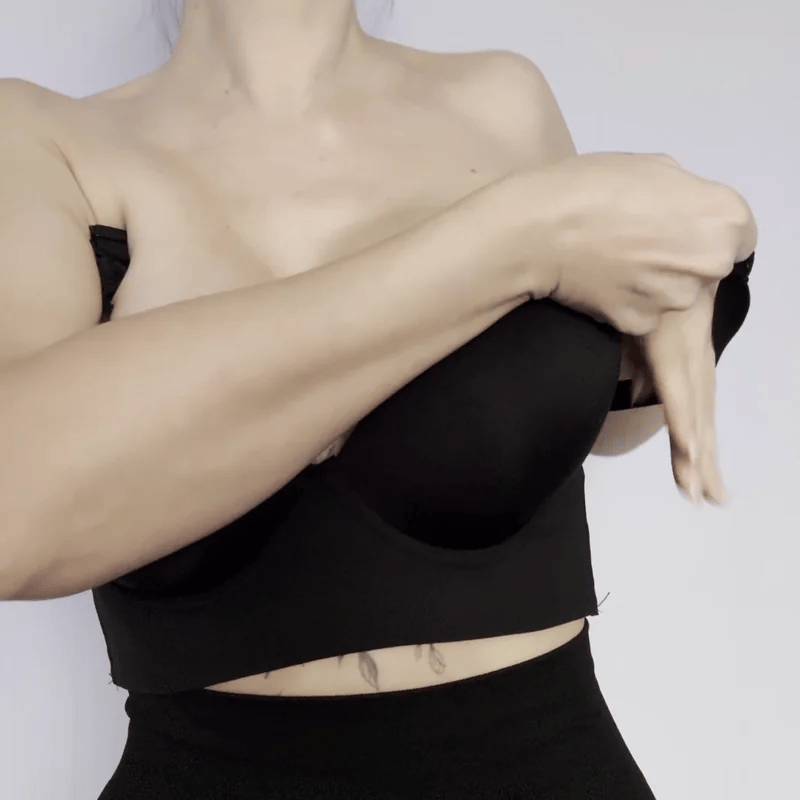 Lean forward so your breasts naturally fall into the cups. This helps them settle correctly inside.